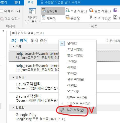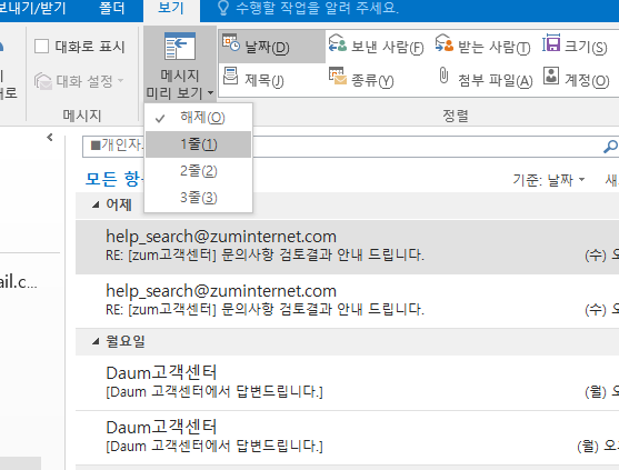 OUTLOOK 하위 버전에서 메일 표시를 한 줄로 해서