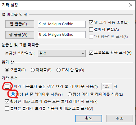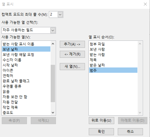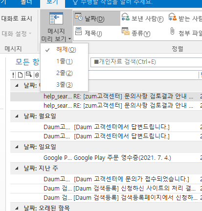 OUTLOOK 하위 버전에서 메일 표시를 한 줄로 해서