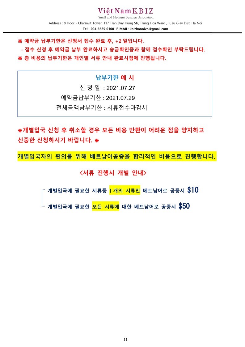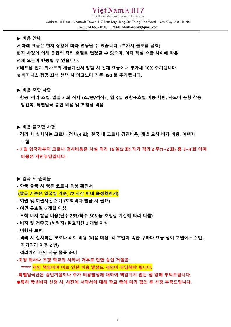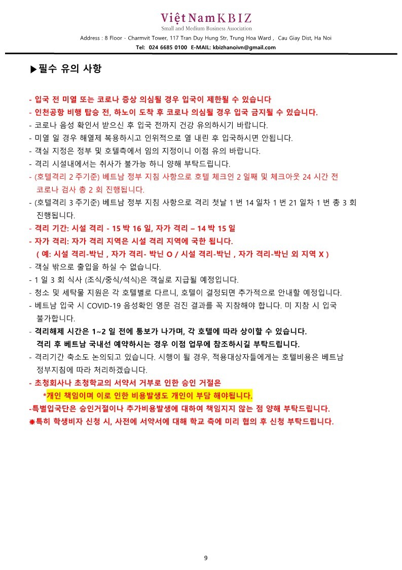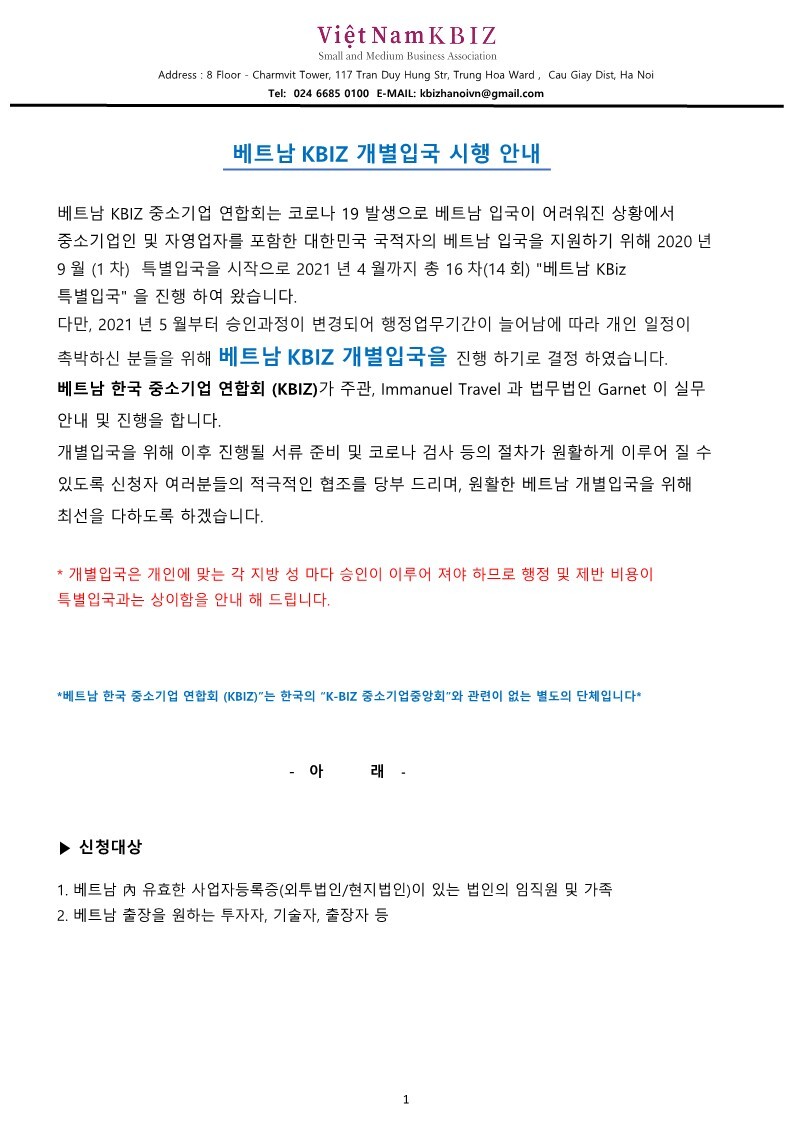 베트남 KBIZ 중소기업연합회 개별입국 안내문