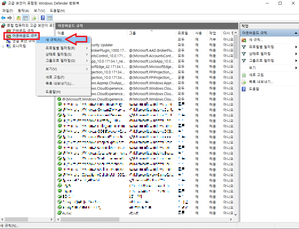 ☞ 다음은 [아웃바운드 규칙] 오른쪽 마우스 클릭 후 [새 규칙]을 클릭하여 같은 절차로 진행하면 됩니다. ↓