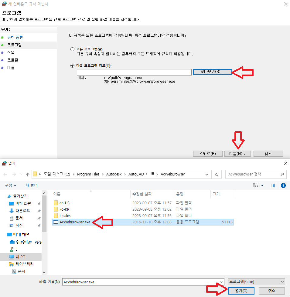 ☞[찾아보기]를 클릭하여 아래 캐드 설치된 폴더 경로로 가서 [AcWebBrowser.exe] 선택하여 [열기]를 클릭합니다. ↓