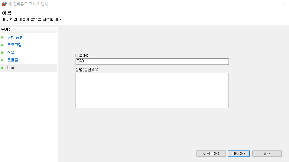 ☞ 아래의 창이 나오면 [이름(N)] 칸에 적당한 이름을 기입하고 [마침(F)]을 클릭합니다. ↓