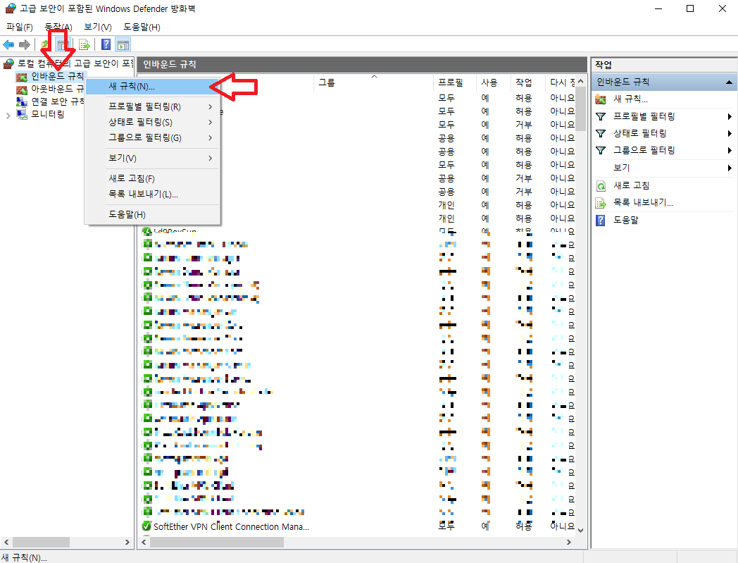 ☞ [인바운드 규칙] 오른쪽 마우스 클릭 후 [새 규칙]을 클릭합니다. ↓