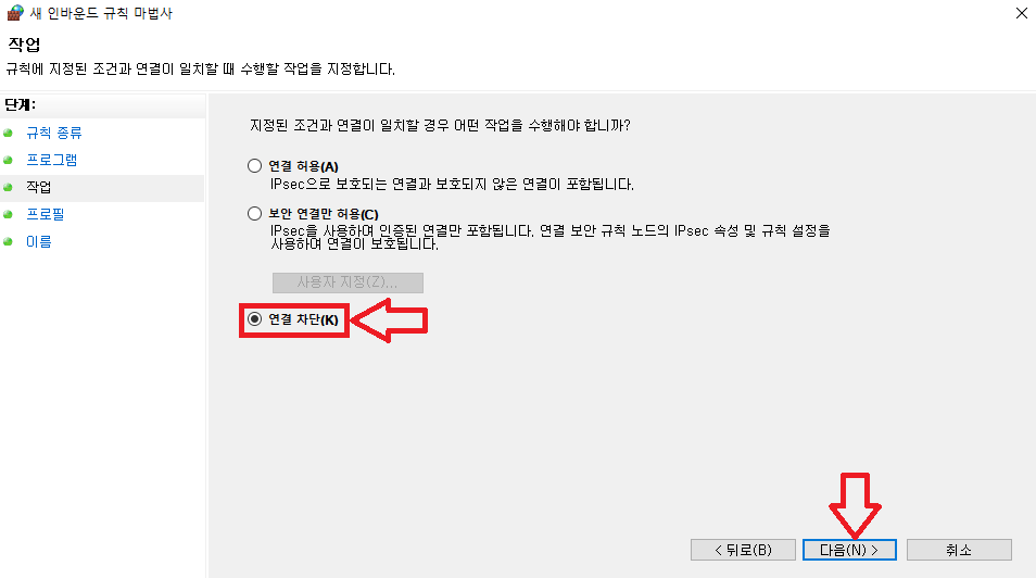 ☞ 아래의 창이 나오면 [연결 차단(K)] 을 선택하고 [다음(N)]을 클릭합니다. ↓