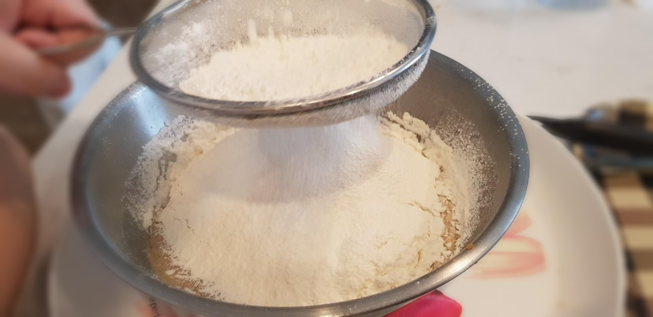 밀가루 종이컵 3컵을 채에 걸러서 넣습니다.