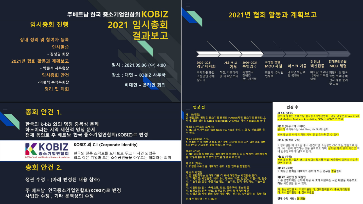 주요 안건은 명칭변경건으로 (KBIZHANOI 중소기업 연합회 -->> 주베트남 한국중소기업연합회 (KOBIZ) 로 명칭변경 확정이 되었으며 이에 따른 정관 변경 및 수정내용은 첨부된 내용을 참고해 주시면 감사하겠습니다.
