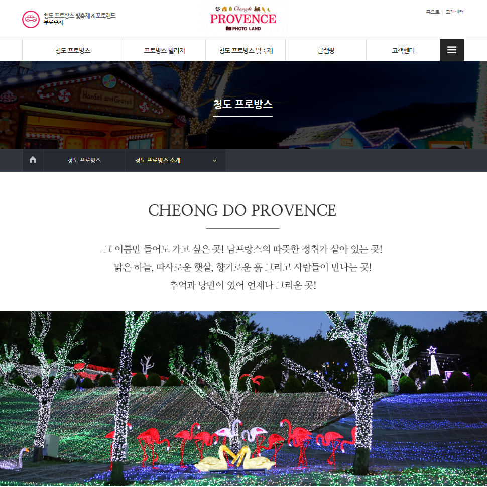 1996년 청도 테마랜드로 시작해, 2012년에는 청도프로방스 포토랜드로 새롭게 단장하여 10년간 여러분을 맞이하고 있습니다. 프랑스의 정감 있는 프로방스 마을을 청도에 그대로 재현했는데요, 낮에는 100여 가지 다양한 포토존과 아기자기한 소품, 예쁜 집들이 여러분을 맞이하고, 어둠이 내리면 눈부시게 빛나는 빛 축제로 변신합니다.