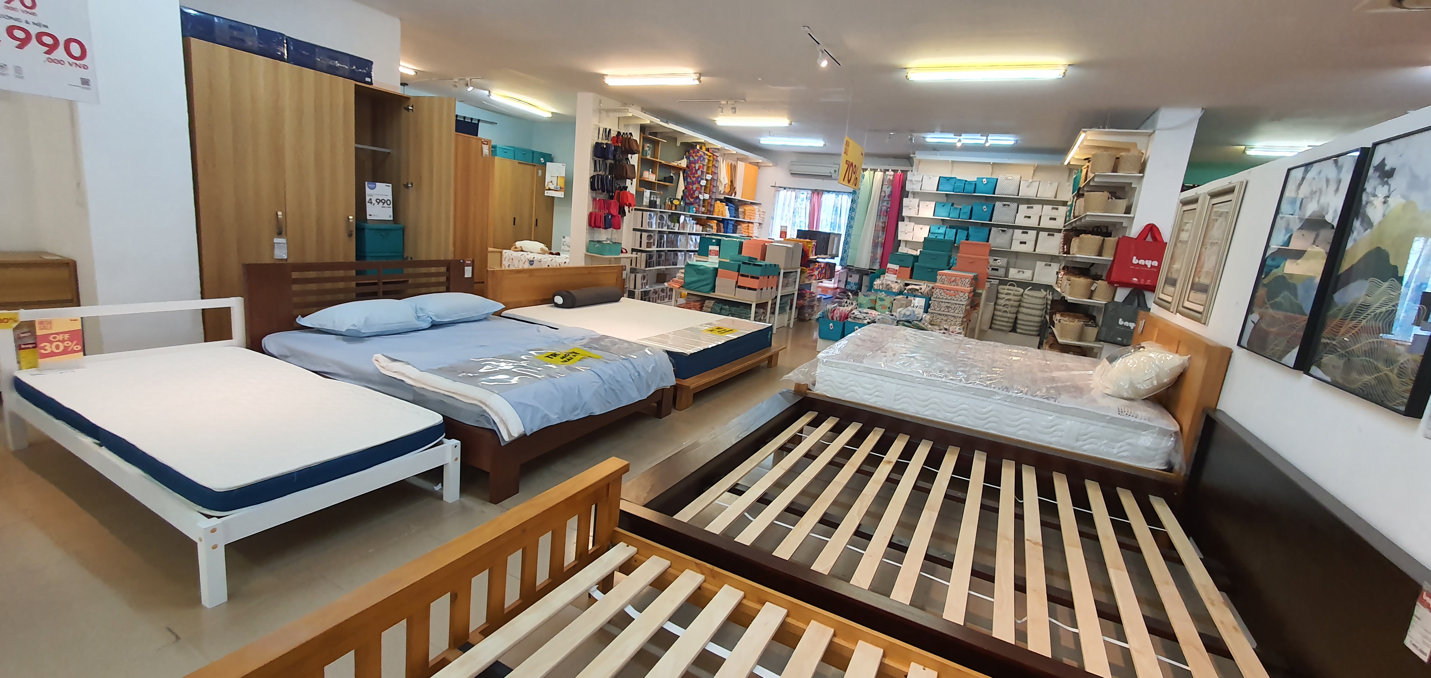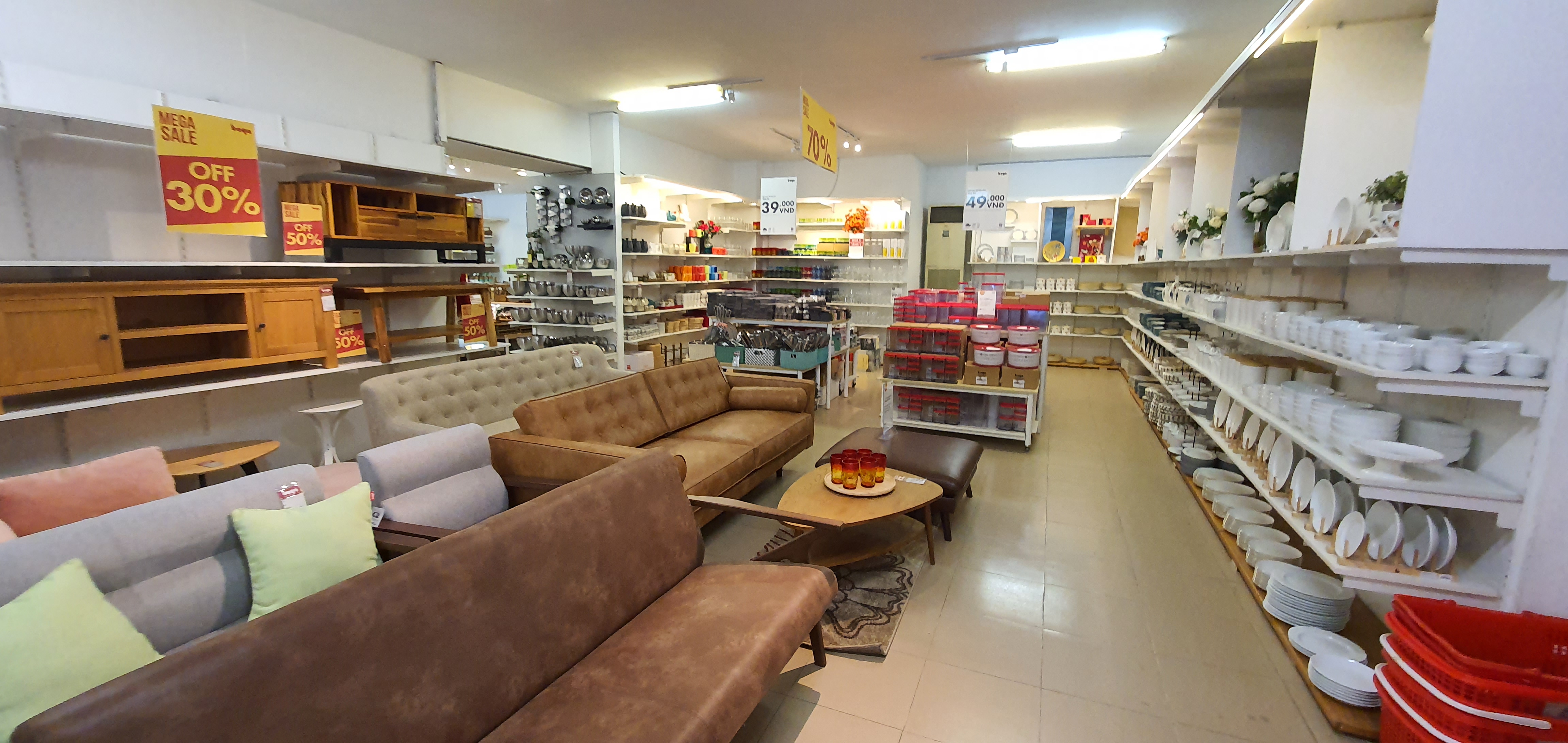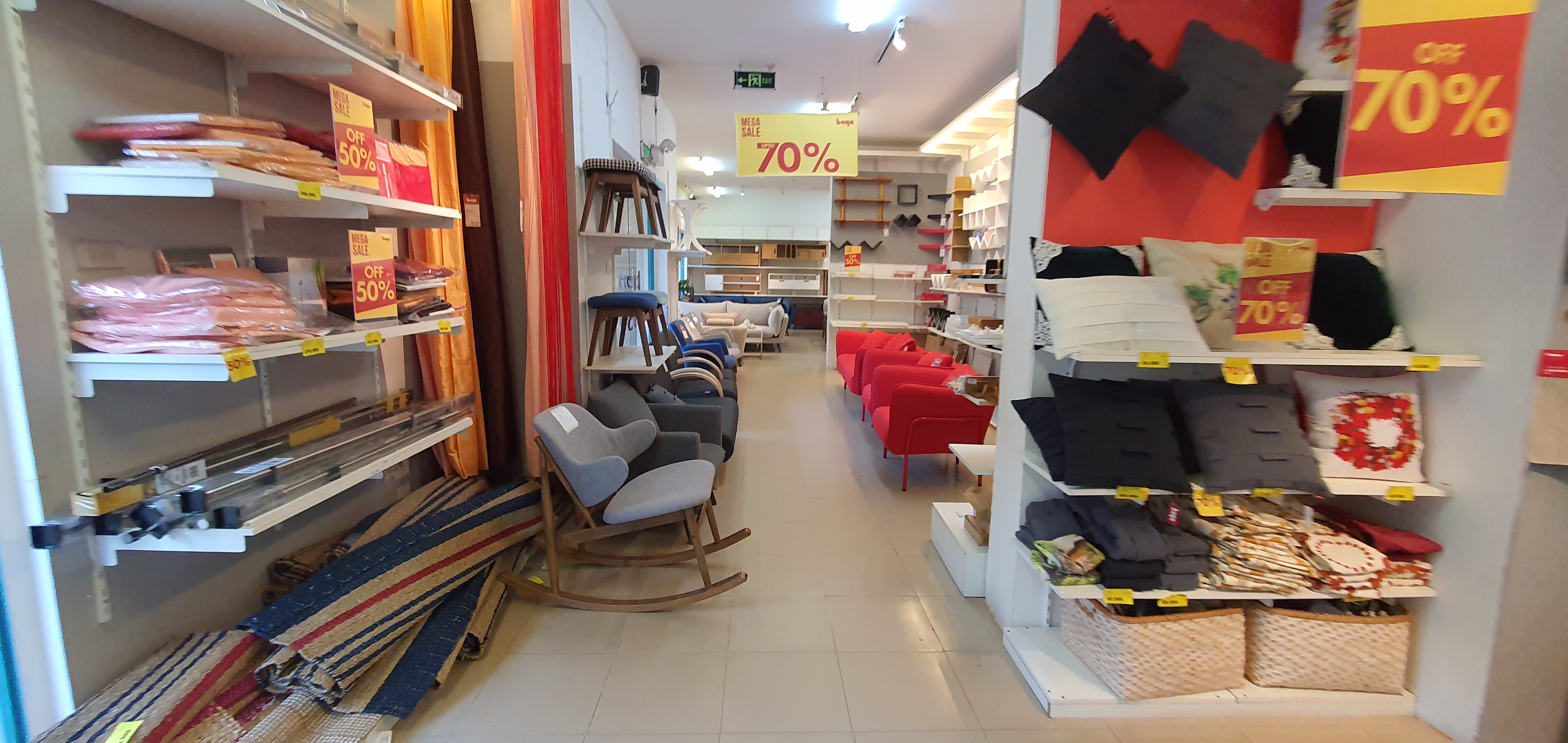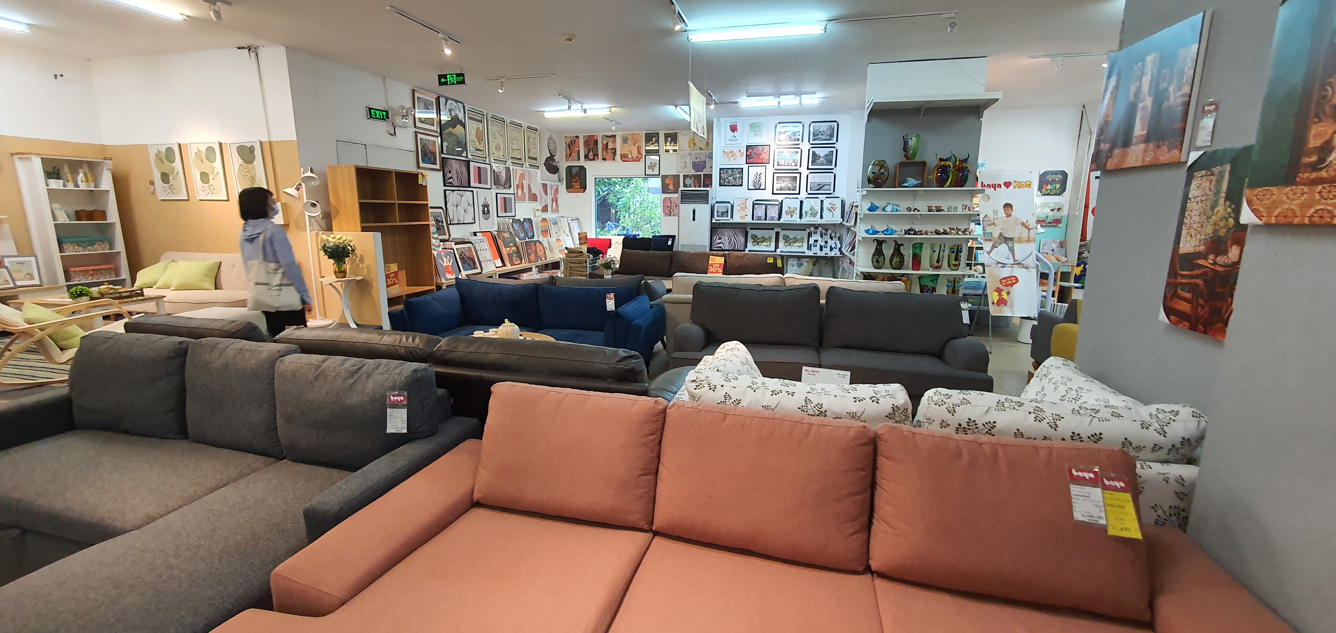 각종 소파, 침구류, 가구, 액자, 주방용품, 생활용품 등 상품들이 많이 진열되어 있습니다.