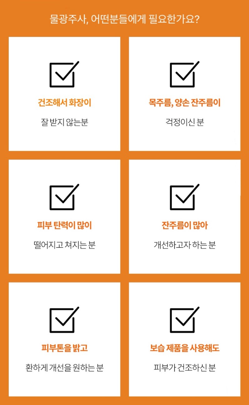 ➡물광주사의 주 성분은 우리 몸의 200~300배 정도의 수분을 지닌 히알루론산입니다. 히알루론산을 피부 진피층에 직접 주사하므로서 피부 속부터 차올라 촉촉하고 광채 나는 피부로 돌려주는 안티에이징 시술이라고 할 수가 있습니다✨