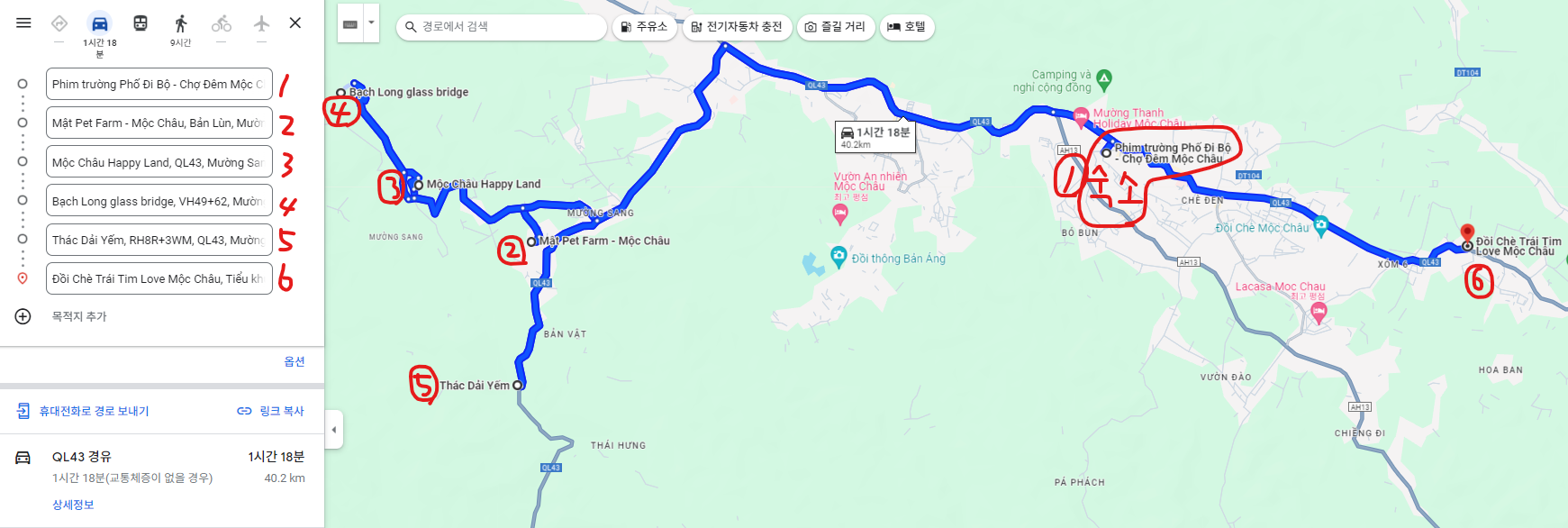 아래는 숙소인 야시장 PHỐ ĐI BỘ MỘC CHÂU의 위치 입니다.