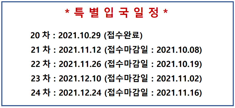 - ▣ 20차 특별입국신청은 첨부된 20차 신청서 양식에 따라 접수 부탁 드립니다.