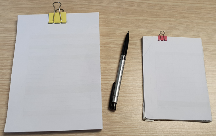 왼쪽은 A4용지를 반으로 잘랐고, 오른쪽은 왼쪽 용지를 반으로 자른 상태입니다. 간단하게 클립만 꽂아 주면 끝입니다. 전 주로 급한 전달 및 업무 관련 전화메모나 간단 미팅 시 이용을 합니다. 수첩이 따로 있습니다만 꺼내고 펼치고 번거로울 때가 있습니다. 항상 사무실 책상엔 이 이면지 노트가 올려져 있습니다.