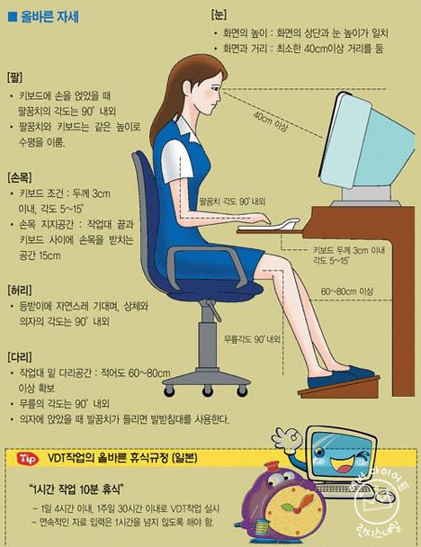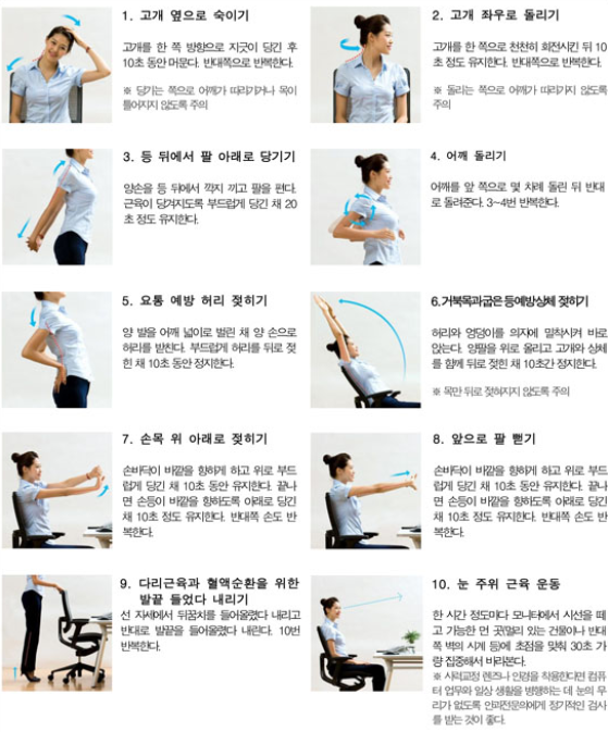 내 몸을 소중히 여기고 자주 의식해서 최대한 바른 사무 자세로 일해야 하며, 꼭 스트레칭을 하는 습관을 길러야 합니다.